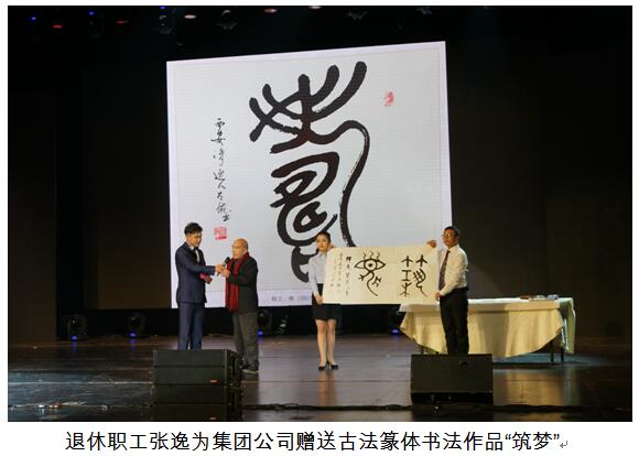 配樂詩朗誦《感恩于心 勵志前行》由中心托管退休職工和青年員工一同表演。在悠揚的音樂聲中,朗誦者時而慷慨激昂、時而低回婉轉(zhuǎn),帶給聽眾無限的遐想。書法表演者張逸現(xiàn)場潑墨,表達(dá)自己對集團(tuán)公司深深的祝福。張逸老先生是原市建四公司的退休職工,也是中國書法家協(xié)會會員,他的作品古樸蒼勁、意味雋永。在聯(lián)歡會現(xiàn)場,張老先生將親筆書寫的“筑夢”二字贈予集團(tuán)公司,希望集團(tuán)公司在實現(xiàn)中華民族偉大復(fù)興“中國夢”的光榮征程中,能夠不忘初心,帶領(lǐng)廣大職工凝心聚力,共同筑起偉大的“建工夢”,并祝愿集團(tuán)在新的一年能夠譜寫出建設(shè)美好西安的嶄新篇章。同時,張老先生將現(xiàn)場書寫的“感恩”二字贈予中心,以表達(dá)退休職工對服務(wù)中心的感謝,希望中心今后的發(fā)展越來越好。張老充滿激情的致辭,贏得了臺下聽眾陣陣喝彩,切實鼓舞了廣大職工干事創(chuàng)業(yè)的士氣。