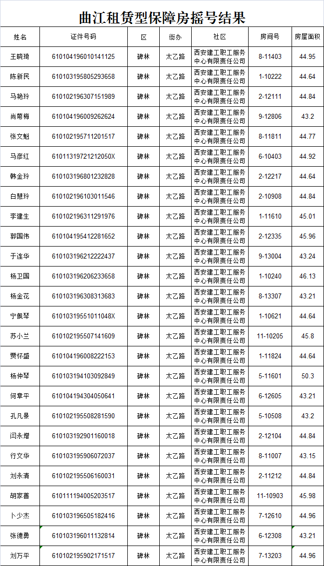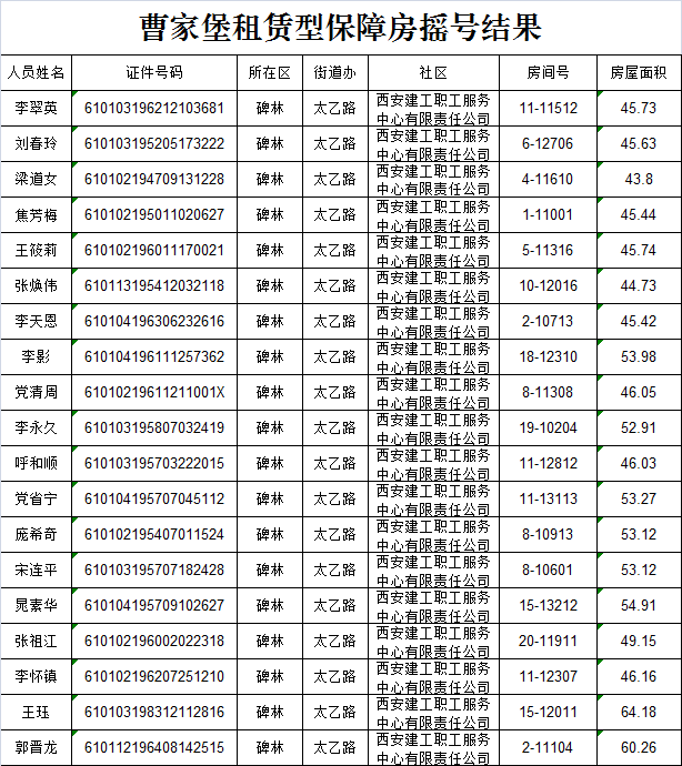 經(jīng)職工服務(wù)中心與太乙路街辦的不斷配合和努力下,目前通過職工服務(wù)中心渠道申請曲江、曹家堡公租房的職工搖號結(jié)果已經(jīng)下達(dá),現(xiàn)將搖號結(jié)果公示如下。后續(xù)看房、簽訂租賃合同等流程,目前日期暫未確定,請職工繼續(xù)關(guān)注職工服務(wù)中心微信公眾號,我們得到消息后會第一時間為您進(jìn)行通知。